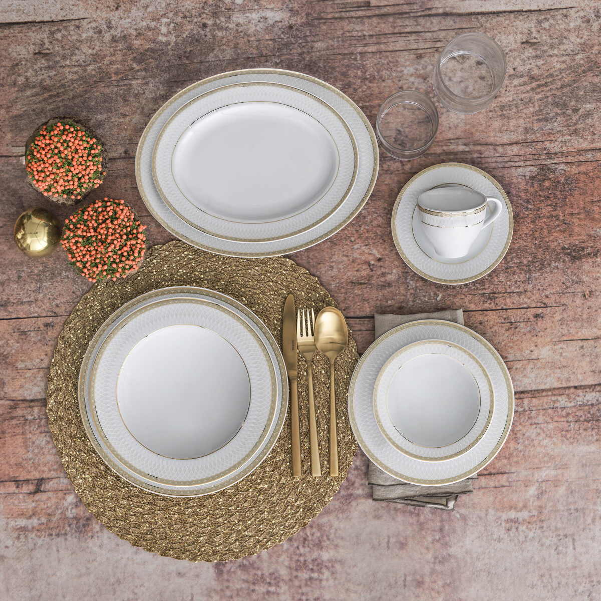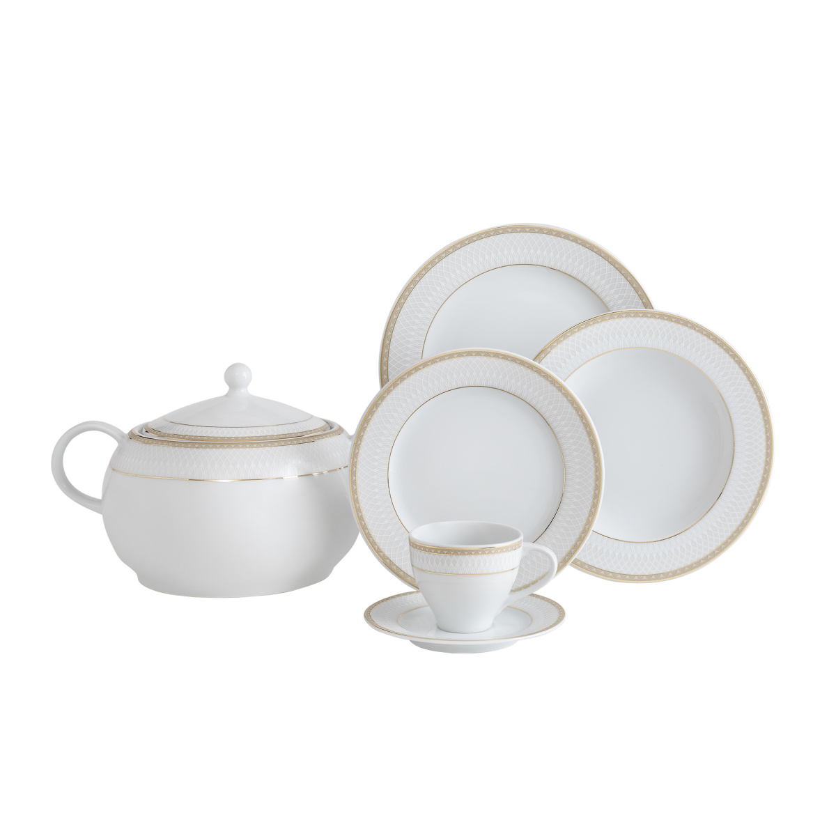 12 Adet 23 Cm Yemek Tabağı 12 Adet 15 Cm Çorba Kasesi 12 Adet 20 Cm Pasta Tabağı 6 Adet Çay Fincanı 6 Adet Çay Fincan Tabağı 6 Adet Kahve Fincanı 6 Adet Kahve Fincan Tabağı 2 Adet Tuzluk 2 Adet Biberlik 1 Adet Kürdanlık 2 Adet 25 Cm Küçük Boy Kayık Tabak 1 Adet 13 Cm Sosluk 1 Adet Sosluk Tabağı 1 Adet 30 Cm Büyük Boy Kayık Tabak 1 Adet Çorbalık 1 Adet Çorbalık Kapağı