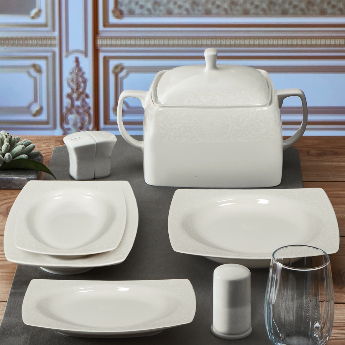 Caroline serisi, şık kare formu ve dayanıklı yapısıyla sunumlarınıza modern bir dokunuş katıyor. 12 kişilik kullanım için tasarlanan bu set, estetik detayları ve üstün kaliteyi bir araya getiriyor.