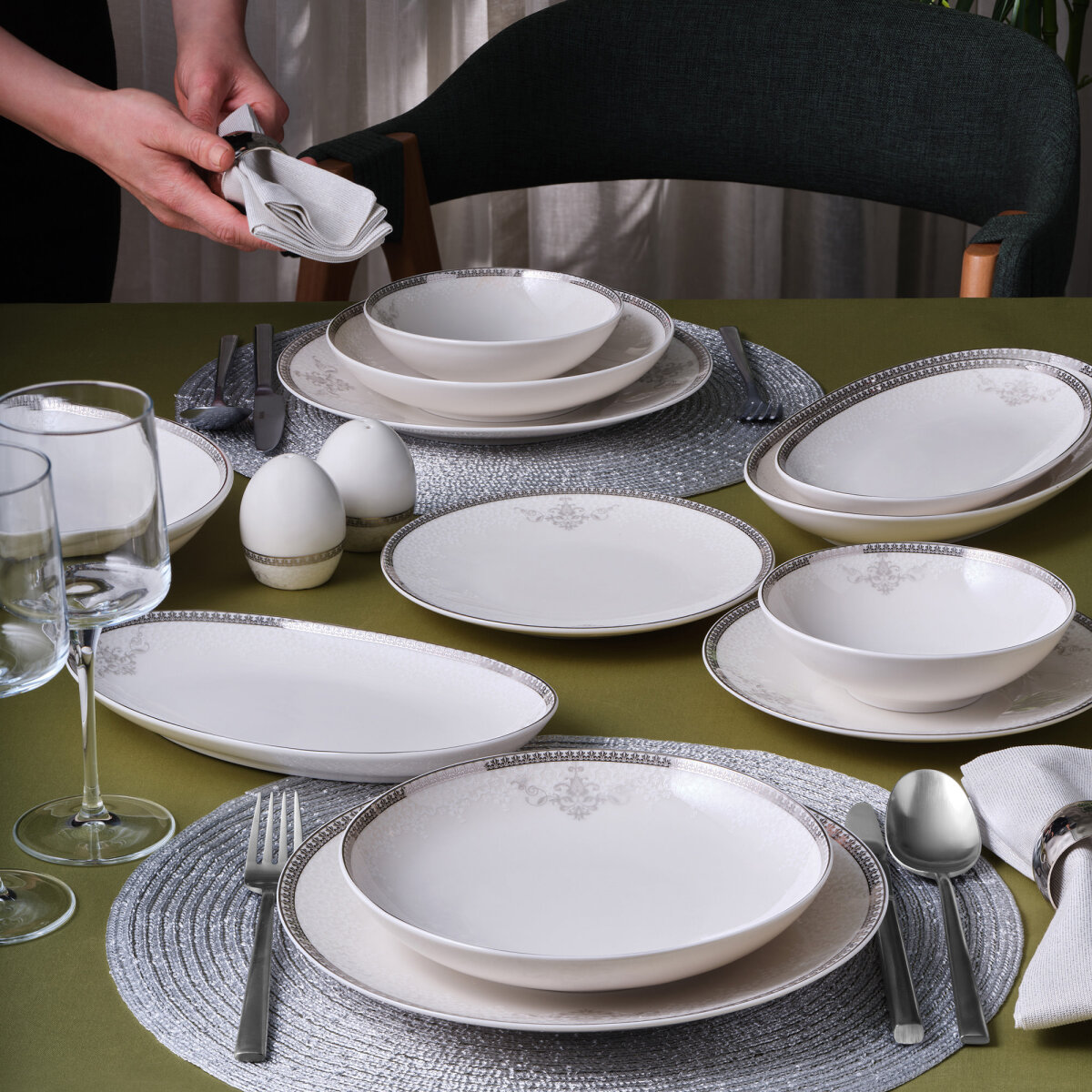 Her bir tabak, sıcak sohbetler ve samimi anılar için bir araya geliyor; sofralarınızın ruhunu zenginleştirerek, misafirlerinizi büyüleyecek unutulmaz anların habercisi oluyor. Bu yemek takımı, zarafetin ve estetiğin bir araya geldiği, her yemeği kutlama haline getiren bir sanat manifestosu.